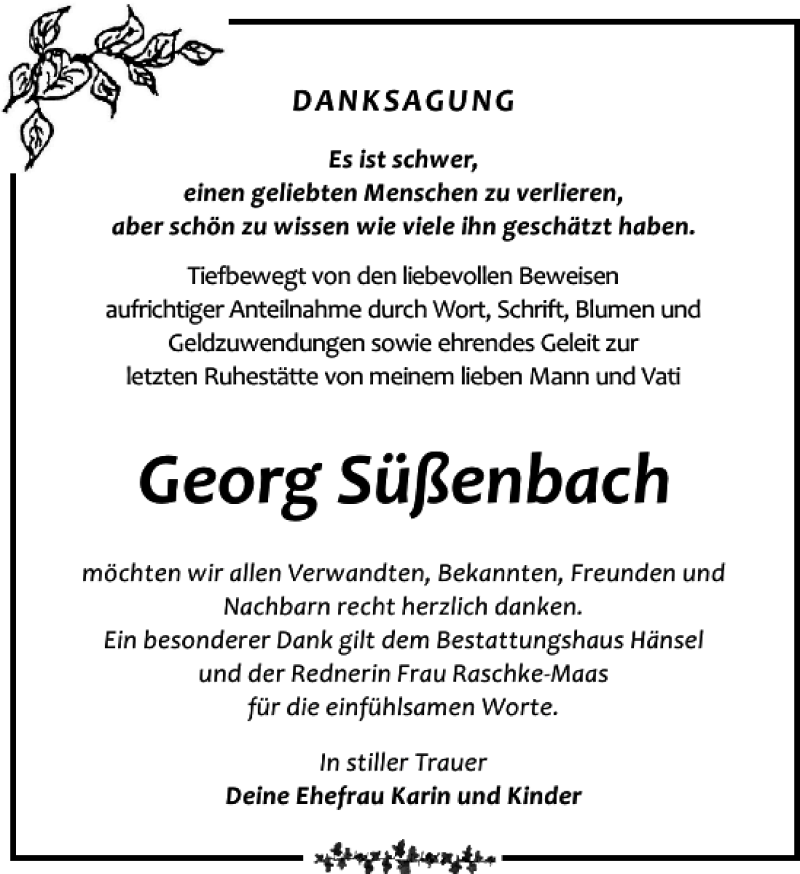 Hier finden Sie alle Traueranzeigen aus der Zeitung, die bisher für Georg Süßenbach erschienen sind. Weitere Traueranzeigen, die in der Zeitung erscheinen, werden hier ebenfalls aufgelistet