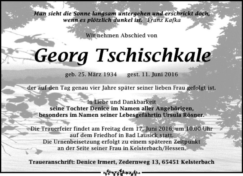 Hier finden Sie alle Traueranzeigen aus der Zeitung, die bisher für Georg Tschischkale erschienen sind. Weitere Traueranzeigen, die in der Zeitung erscheinen, werden hier ebenfalls aufgelistet