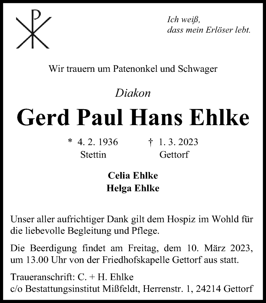 Hier finden Sie alle Traueranzeigen aus der Zeitung, die bisher für Gerd Paul Hans Ehlke erschienen sind. Weitere Traueranzeigen, die in der Zeitung erscheinen, werden hier ebenfalls aufgelistet