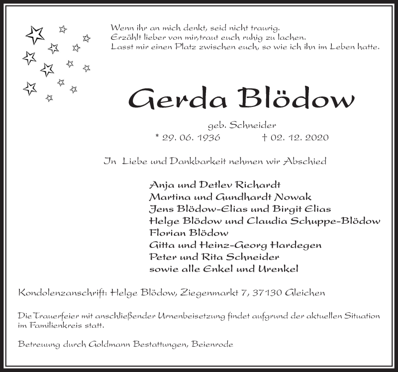 Hier finden Sie alle Traueranzeigen aus der Zeitung, die bisher für Gerda Blödow erschienen sind. Weitere Traueranzeigen, die in der Zeitung erscheinen, werden hier ebenfalls aufgelistet