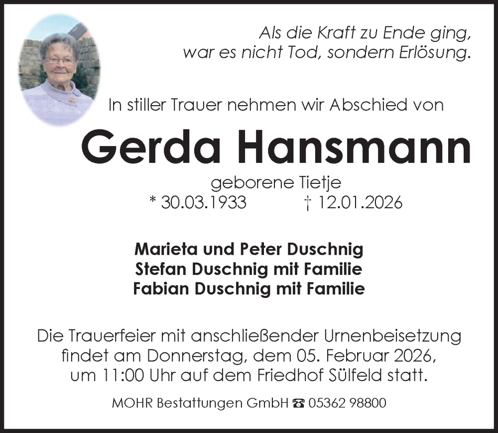 Hier finden Sie alle Traueranzeigen aus der Zeitung, die bisher für Gerda Hansmann erschienen sind. Weitere Traueranzeigen, die in der Zeitung erscheinen, werden hier ebenfalls aufgelistet