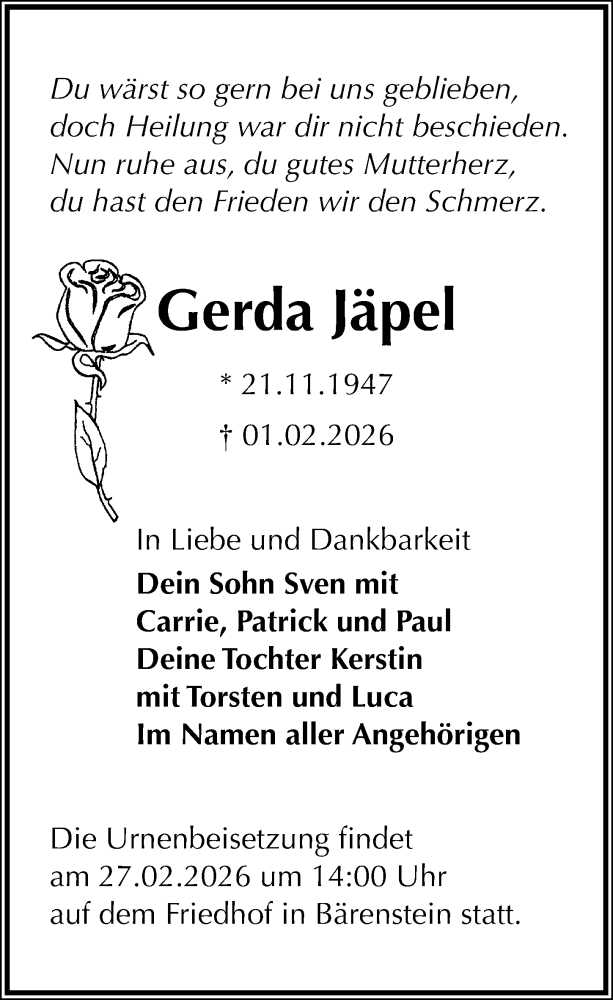 Hier finden Sie alle Traueranzeigen aus der Zeitung, die bisher für Gerda Jäpel erschienen sind. Weitere Traueranzeigen, die in der Zeitung erscheinen, werden hier ebenfalls aufgelistet