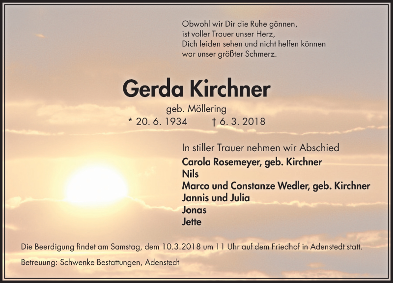 Hier finden Sie alle Traueranzeigen aus der Zeitung, die bisher für Gerda Kirchner erschienen sind. Weitere Traueranzeigen, die in der Zeitung erscheinen, werden hier ebenfalls aufgelistet