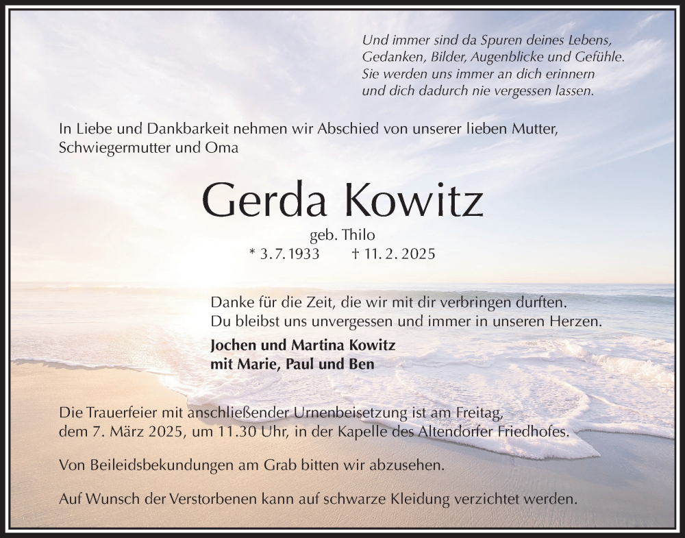 Hier finden Sie alle Traueranzeigen aus der Zeitung, die bisher für Gerda Kowitz erschienen sind. Weitere Traueranzeigen, die in der Zeitung erscheinen, werden hier ebenfalls aufgelistet