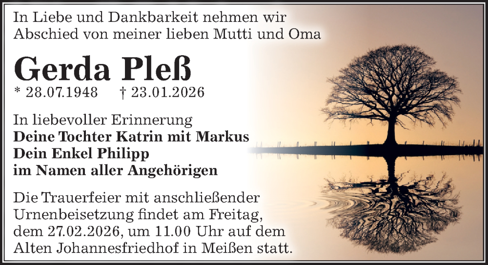 Hier finden Sie alle Traueranzeigen aus der Zeitung, die bisher für Gerda Pleß erschienen sind. Weitere Traueranzeigen, die in der Zeitung erscheinen, werden hier ebenfalls aufgelistet