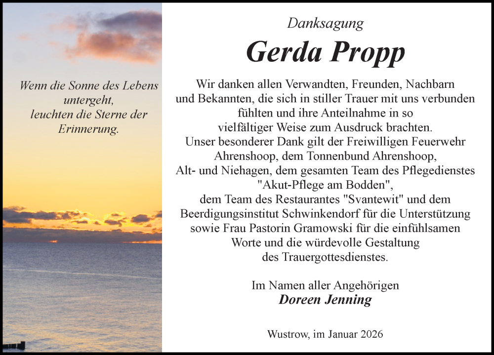 Hier finden Sie alle Traueranzeigen aus der Zeitung, die bisher für Gerda Propp erschienen sind. Weitere Traueranzeigen, die in der Zeitung erscheinen, werden hier ebenfalls aufgelistet