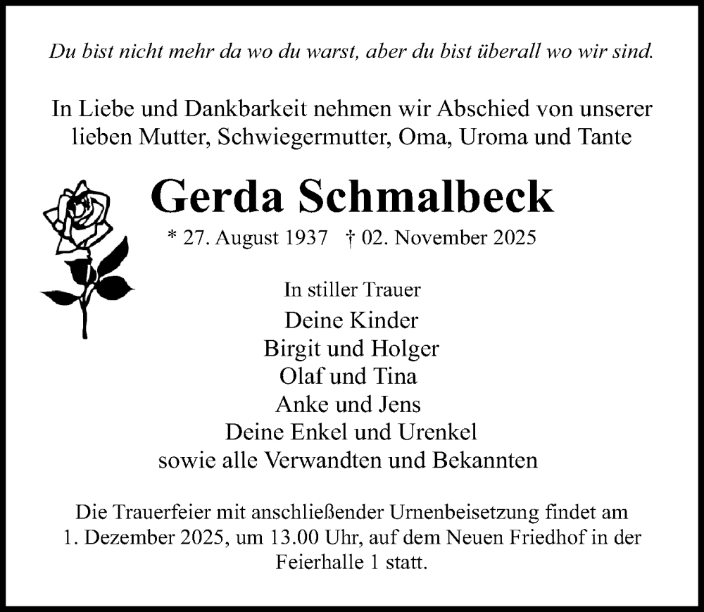 Hier finden Sie alle Traueranzeigen aus der Zeitung, die bisher für Gerda Schmalbeck erschienen sind. Weitere Traueranzeigen, die in der Zeitung erscheinen, werden hier ebenfalls aufgelistet