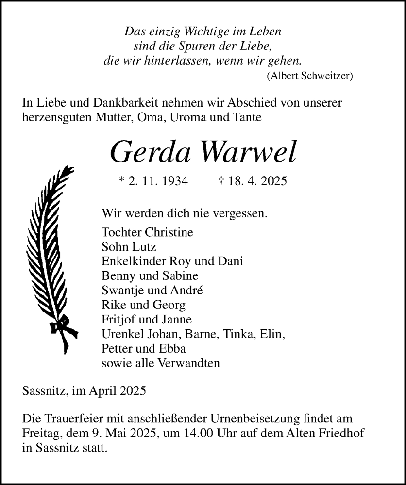 Hier finden Sie alle Traueranzeigen aus der Zeitung, die bisher für Gerda Warwel erschienen sind. Weitere Traueranzeigen, die in der Zeitung erscheinen, werden hier ebenfalls aufgelistet