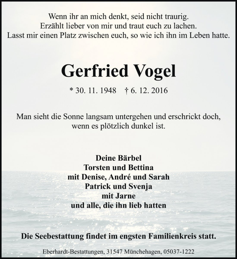 Hier finden Sie alle Traueranzeigen aus der Zeitung, die bisher für Gerfried Vogel erschienen sind. Weitere Traueranzeigen, die in der Zeitung erscheinen, werden hier ebenfalls aufgelistet