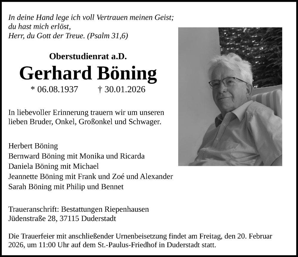 Hier finden Sie alle Traueranzeigen aus der Zeitung, die bisher für Gerhard Böning erschienen sind. Weitere Traueranzeigen, die in der Zeitung erscheinen, werden hier ebenfalls aufgelistet