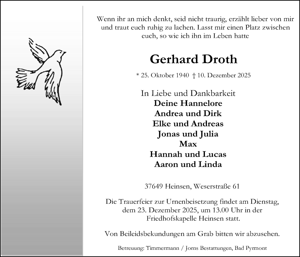Hier finden Sie alle Traueranzeigen aus der Zeitung, die bisher für Gerhard Droth erschienen sind. Weitere Traueranzeigen, die in der Zeitung erscheinen, werden hier ebenfalls aufgelistet