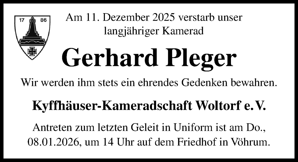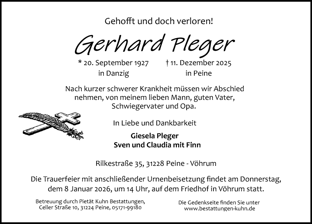 Hier finden Sie alle Traueranzeigen aus der Zeitung, die bisher für Gerhard Pleger erschienen sind. Weitere Traueranzeigen, die in der Zeitung erscheinen, werden hier ebenfalls aufgelistet
