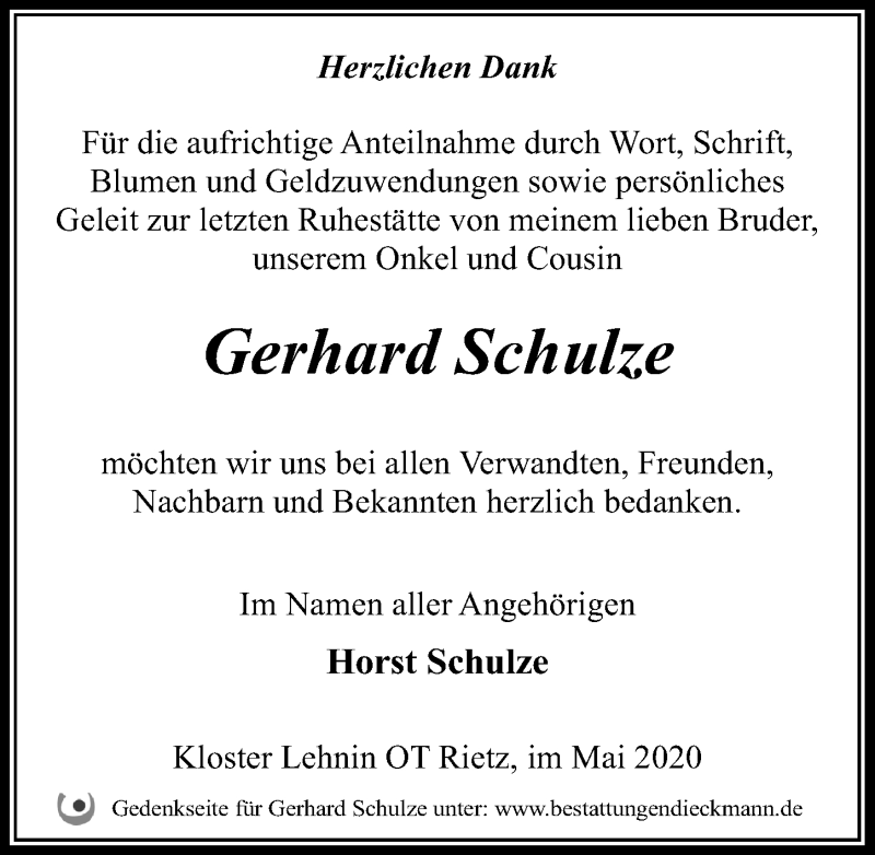 Hier finden Sie alle Traueranzeigen aus der Zeitung, die bisher für Gerhard Schulze erschienen sind. Weitere Traueranzeigen, die in der Zeitung erscheinen, werden hier ebenfalls aufgelistet