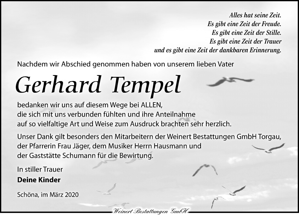 Hier finden Sie alle Traueranzeigen aus der Zeitung, die bisher für Gerhard Tempel erschienen sind. Weitere Traueranzeigen, die in der Zeitung erscheinen, werden hier ebenfalls aufgelistet