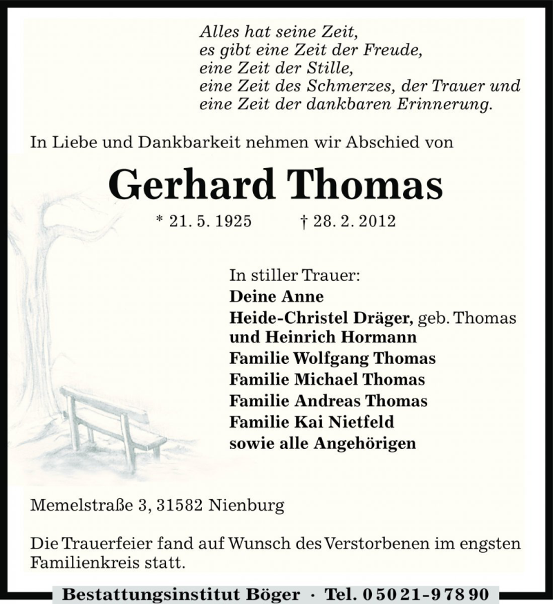Hier finden Sie alle Traueranzeigen aus der Zeitung, die bisher für Gerhard Thomas erschienen sind. Weitere Traueranzeigen, die in der Zeitung erscheinen, werden hier ebenfalls aufgelistet