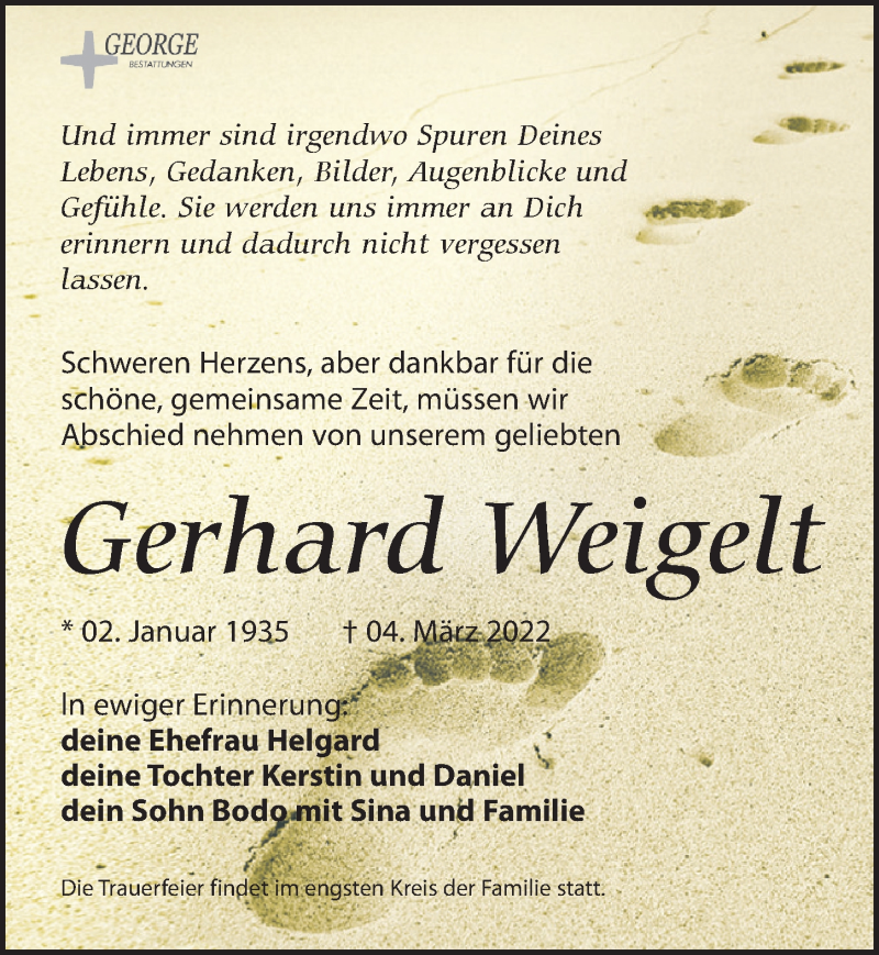 Hier finden Sie alle Traueranzeigen aus der Zeitung, die bisher für Gerhard Weigelt erschienen sind. Weitere Traueranzeigen, die in der Zeitung erscheinen, werden hier ebenfalls aufgelistet