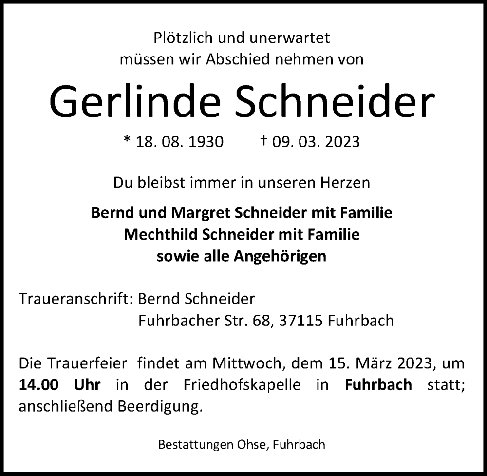 Hier finden Sie alle Traueranzeigen aus der Zeitung, die bisher für Gerlinde Schneider erschienen sind. Weitere Traueranzeigen, die in der Zeitung erscheinen, werden hier ebenfalls aufgelistet