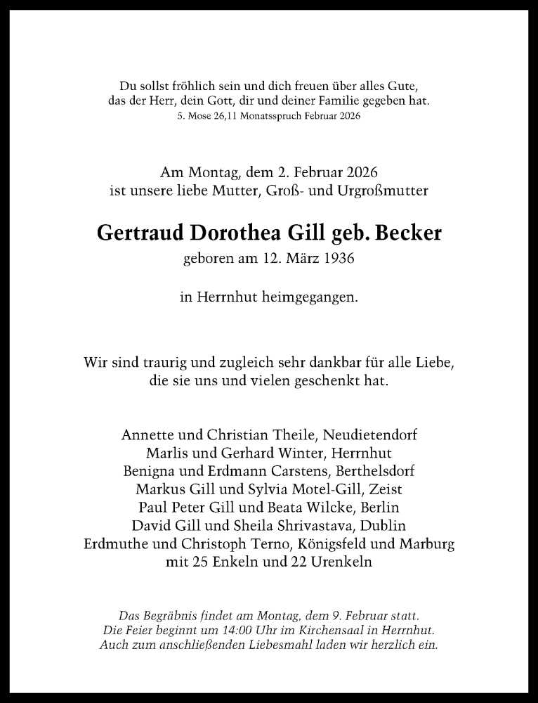 Hier finden Sie alle Traueranzeigen aus der Zeitung, die bisher für Gertraud Dorothea Gill erschienen sind. Weitere Traueranzeigen, die in der Zeitung erscheinen, werden hier ebenfalls aufgelistet