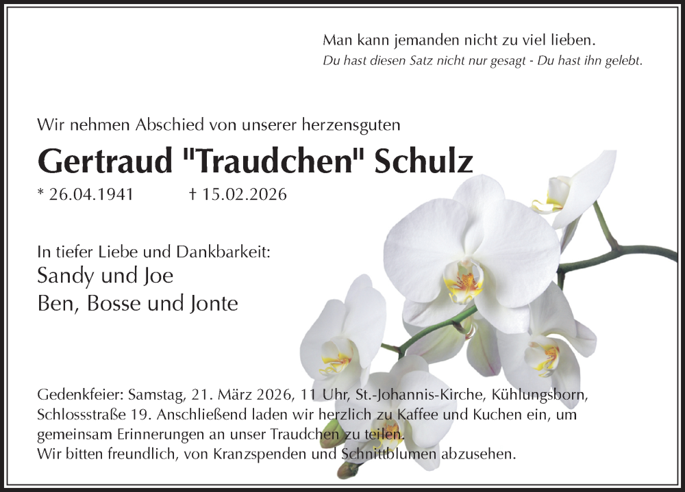Hier finden Sie alle Traueranzeigen aus der Zeitung, die bisher für Gertraud Schulz erschienen sind. Weitere Traueranzeigen, die in der Zeitung erscheinen, werden hier ebenfalls aufgelistet