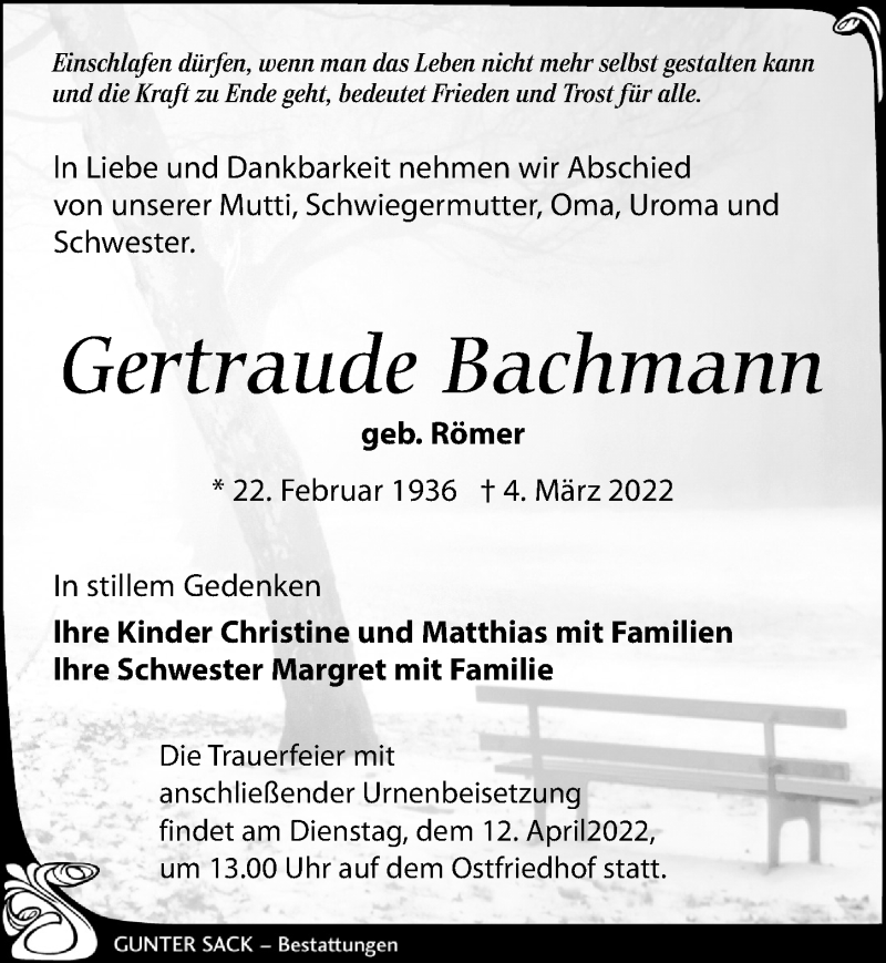 Hier finden Sie alle Traueranzeigen aus der Zeitung, die bisher für Gertraude Bachmann erschienen sind. Weitere Traueranzeigen, die in der Zeitung erscheinen, werden hier ebenfalls aufgelistet