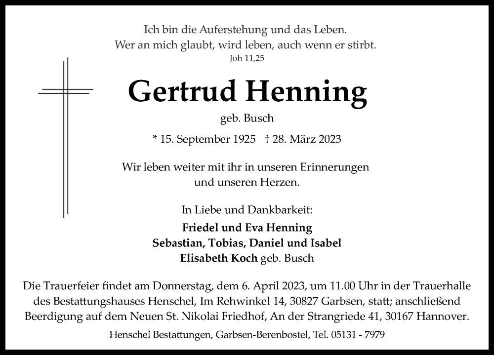 Hier finden Sie alle Traueranzeigen aus der Zeitung, die bisher für Gertrud Henning erschienen sind. Weitere Traueranzeigen, die in der Zeitung erscheinen, werden hier ebenfalls aufgelistet
