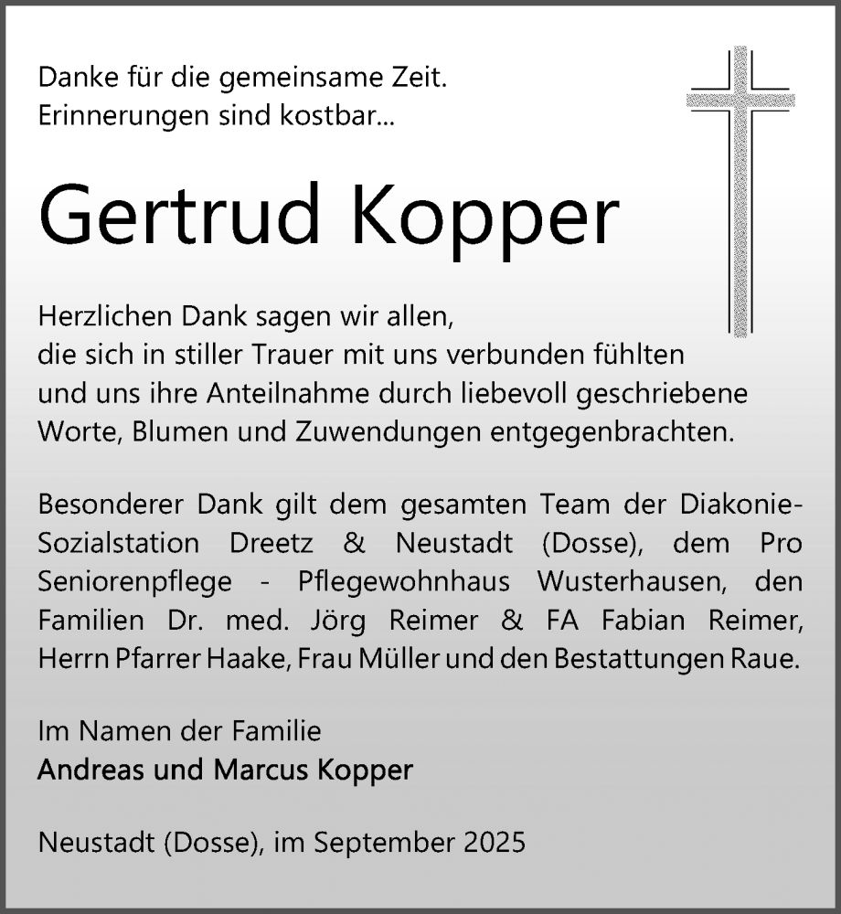 Hier finden Sie alle Traueranzeigen aus der Zeitung, die bisher für Gertrud Kopper erschienen sind. Weitere Traueranzeigen, die in der Zeitung erscheinen, werden hier ebenfalls aufgelistet