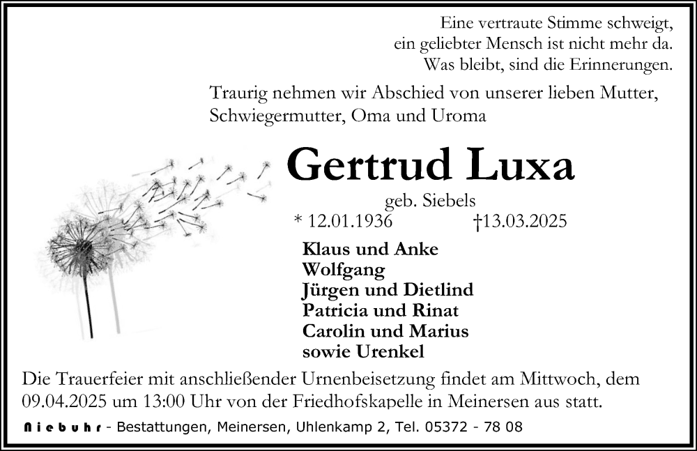 Hier finden Sie alle Traueranzeigen aus der Zeitung, die bisher für Gertrud Luxa erschienen sind. Weitere Traueranzeigen, die in der Zeitung erscheinen, werden hier ebenfalls aufgelistet