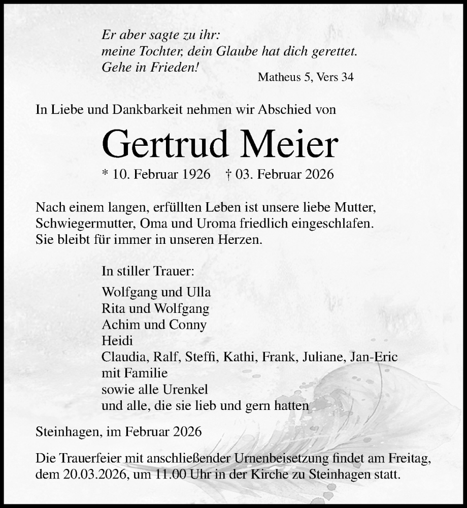 Hier finden Sie alle Traueranzeigen aus der Zeitung, die bisher für Gertrud Meier erschienen sind. Weitere Traueranzeigen, die in der Zeitung erscheinen, werden hier ebenfalls aufgelistet