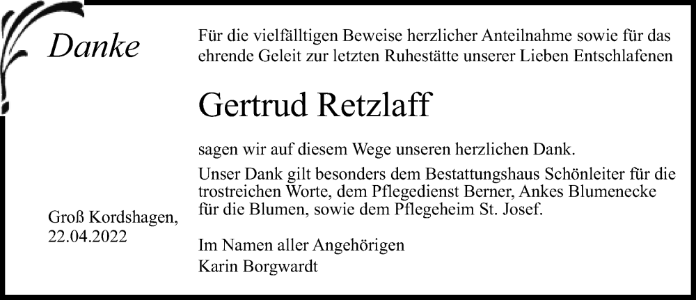 Hier finden Sie alle Traueranzeigen aus der Zeitung, die bisher für Gertrud Retzlaff erschienen sind. Weitere Traueranzeigen, die in der Zeitung erscheinen, werden hier ebenfalls aufgelistet