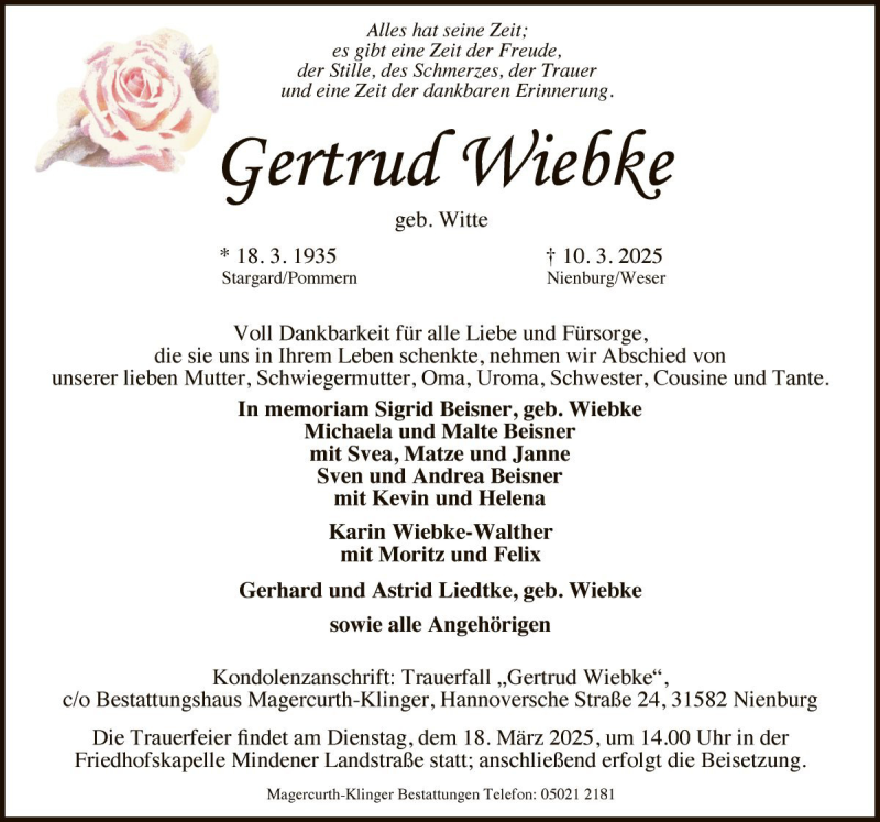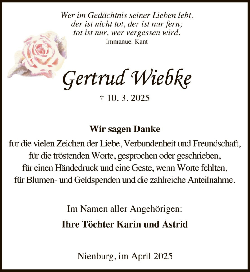 Hier finden Sie alle Traueranzeigen aus der Zeitung, die bisher für Gertrud Wiebke erschienen sind. Weitere Traueranzeigen, die in der Zeitung erscheinen, werden hier ebenfalls aufgelistet