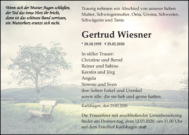 Hier finden Sie alle Traueranzeigen aus der Zeitung, die bisher für Gertrud Wiesner erschienen sind. Weitere Traueranzeigen, die in der Zeitung erscheinen, werden hier ebenfalls aufgelistet