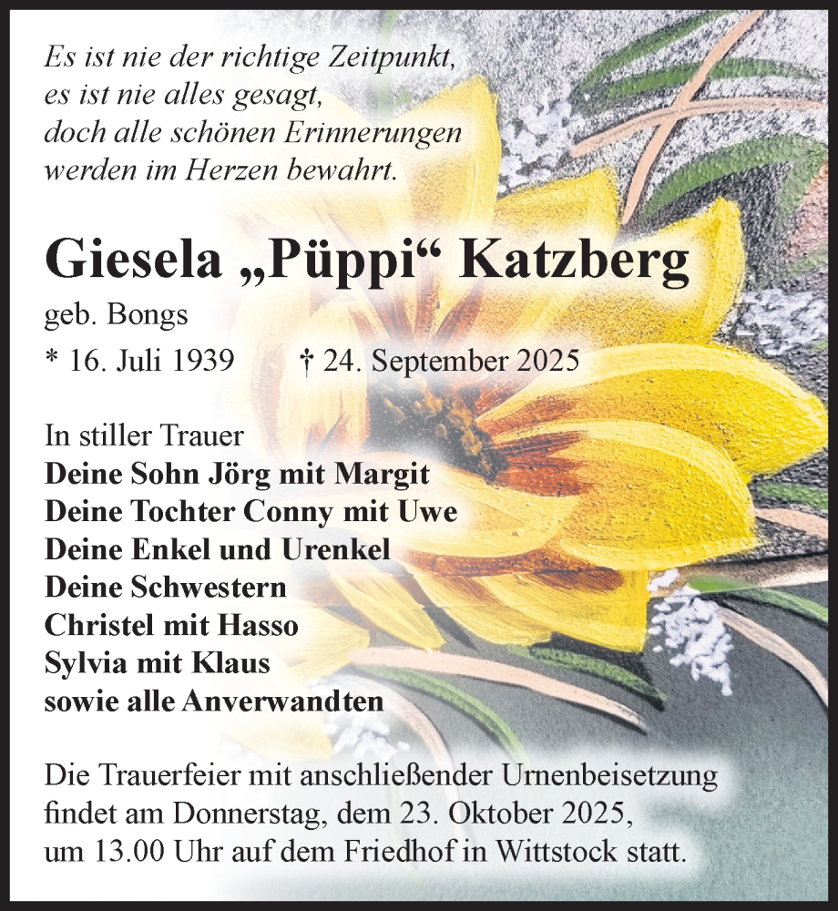 Hier finden Sie alle Traueranzeigen aus der Zeitung, die bisher für Giesela Katzberg erschienen sind. Weitere Traueranzeigen, die in der Zeitung erscheinen, werden hier ebenfalls aufgelistet
