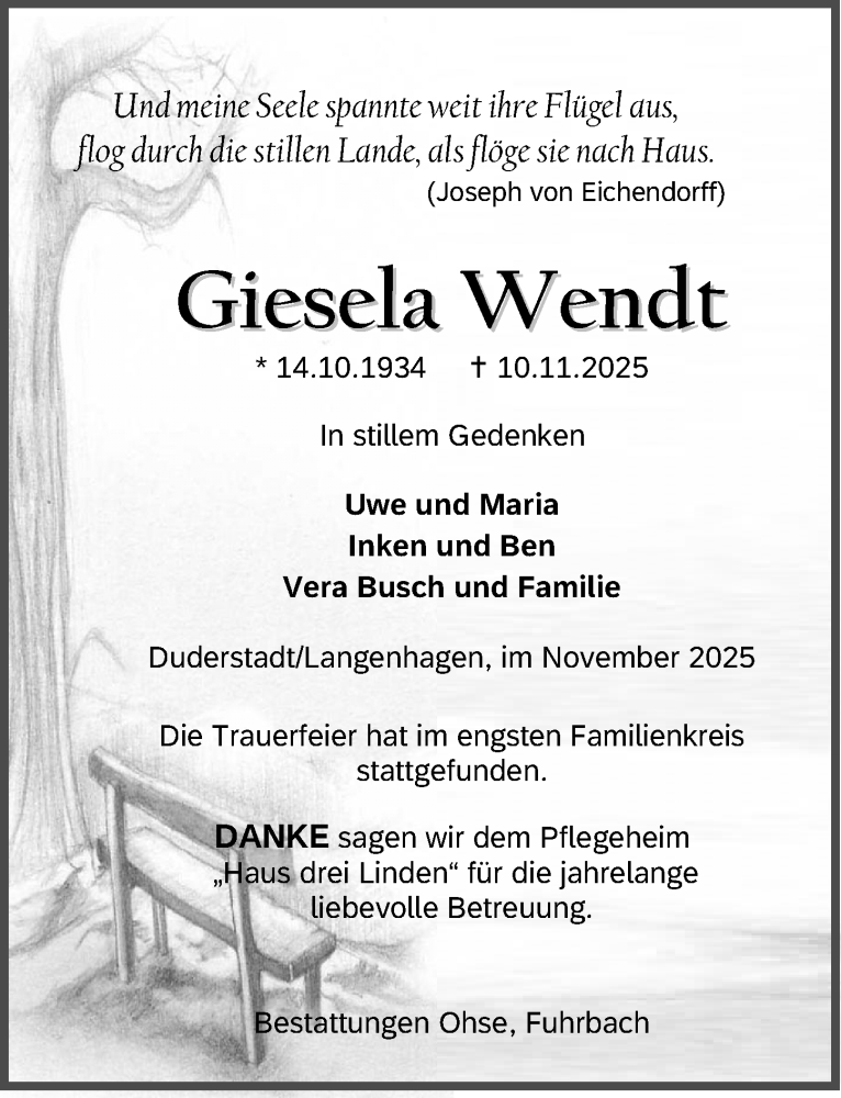 Hier finden Sie alle Traueranzeigen aus der Zeitung, die bisher für Giesela Wendt erschienen sind. Weitere Traueranzeigen, die in der Zeitung erscheinen, werden hier ebenfalls aufgelistet