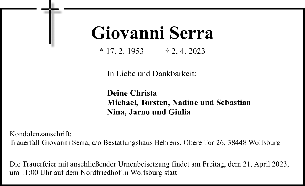 Hier finden Sie alle Traueranzeigen aus der Zeitung, die bisher für Giovanni Serra erschienen sind. Weitere Traueranzeigen, die in der Zeitung erscheinen, werden hier ebenfalls aufgelistet