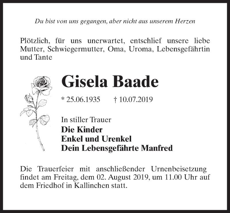 Hier finden Sie alle Traueranzeigen aus der Zeitung, die bisher für Gisela Baade erschienen sind. Weitere Traueranzeigen, die in der Zeitung erscheinen, werden hier ebenfalls aufgelistet
