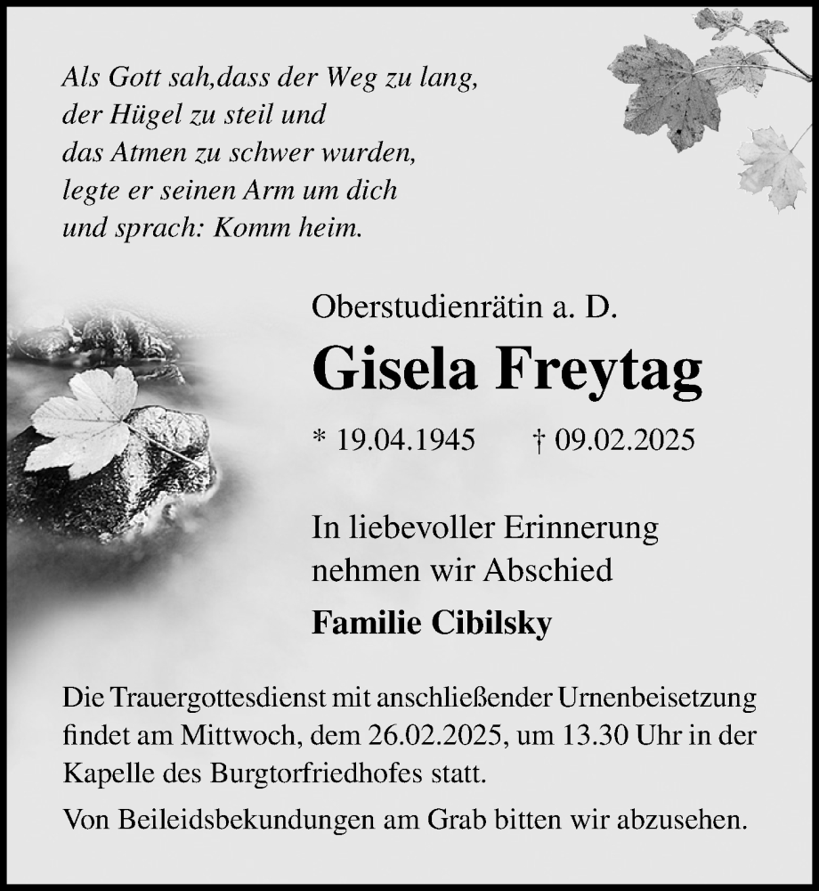Hier finden Sie alle Traueranzeigen aus der Zeitung, die bisher für Gisela Freytag erschienen sind. Weitere Traueranzeigen, die in der Zeitung erscheinen, werden hier ebenfalls aufgelistet