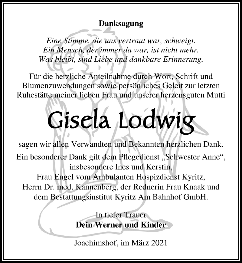 Hier finden Sie alle Traueranzeigen aus der Zeitung, die bisher für Gisela Lodwig erschienen sind. Weitere Traueranzeigen, die in der Zeitung erscheinen, werden hier ebenfalls aufgelistet