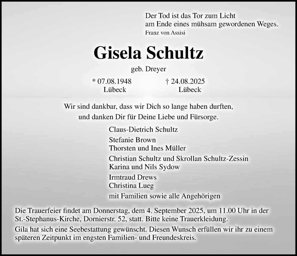 Hier finden Sie alle Traueranzeigen aus der Zeitung, die bisher für Gisela Schultz erschienen sind. Weitere Traueranzeigen, die in der Zeitung erscheinen, werden hier ebenfalls aufgelistet