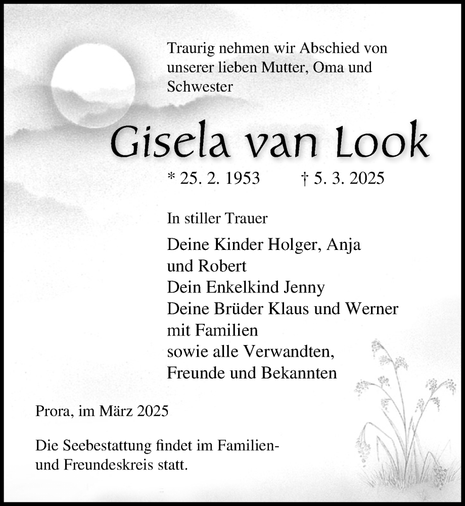 Hier finden Sie alle Traueranzeigen aus der Zeitung, die bisher für Gisela van Look erschienen sind. Weitere Traueranzeigen, die in der Zeitung erscheinen, werden hier ebenfalls aufgelistet