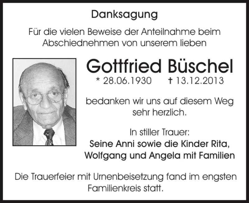 Hier finden Sie alle Traueranzeigen aus der Zeitung, die bisher für Gottfried Büschel erschienen sind. Weitere Traueranzeigen, die in der Zeitung erscheinen, werden hier ebenfalls aufgelistet
