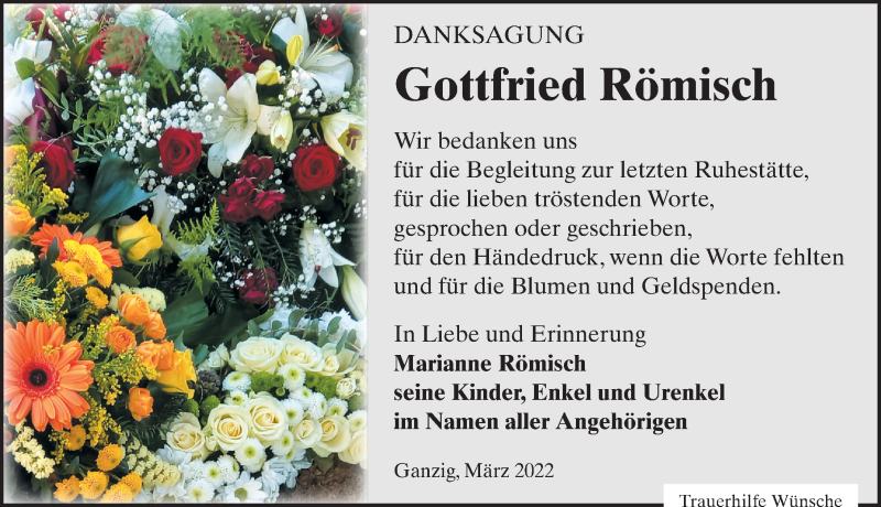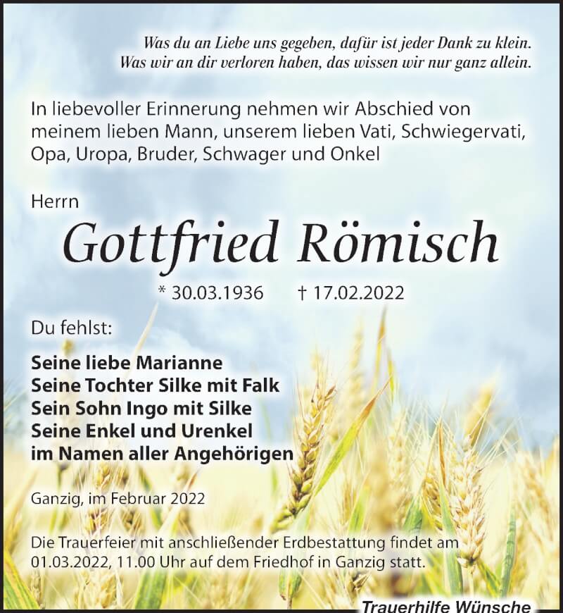Hier finden Sie alle Traueranzeigen aus der Zeitung, die bisher für Gottfried Römisch erschienen sind. Weitere Traueranzeigen, die in der Zeitung erscheinen, werden hier ebenfalls aufgelistet