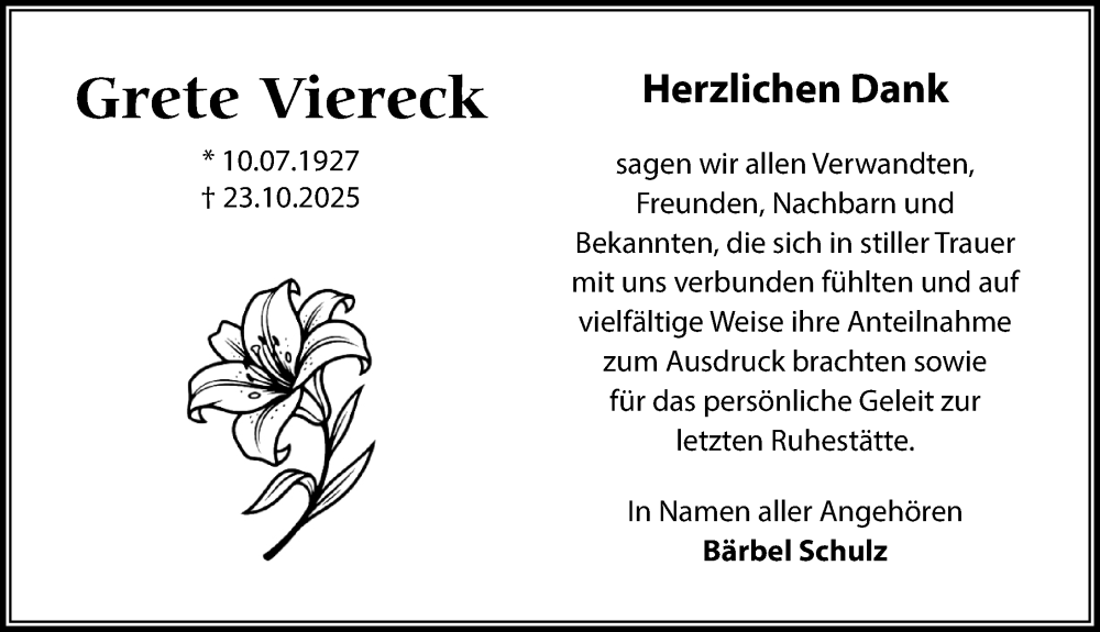 Hier finden Sie alle Traueranzeigen aus der Zeitung, die bisher für Grete Viereck erschienen sind. Weitere Traueranzeigen, die in der Zeitung erscheinen, werden hier ebenfalls aufgelistet