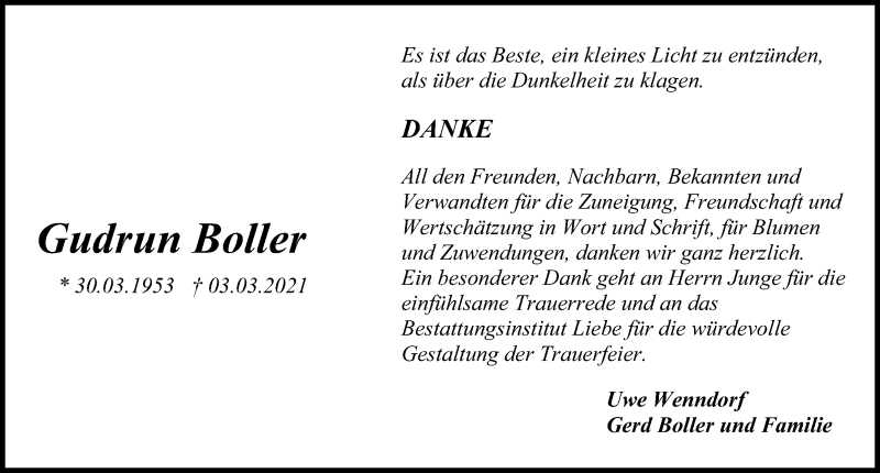 Hier finden Sie alle Traueranzeigen aus der Zeitung, die bisher für Gudrun Boller erschienen sind. Weitere Traueranzeigen, die in der Zeitung erscheinen, werden hier ebenfalls aufgelistet