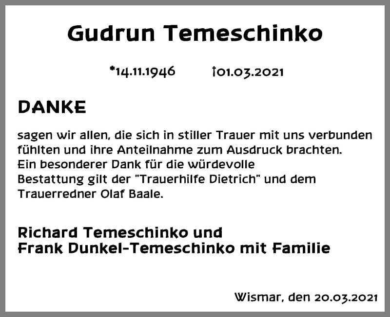 Hier finden Sie alle Traueranzeigen aus der Zeitung, die bisher für Gudrun Temeschinko erschienen sind. Weitere Traueranzeigen, die in der Zeitung erscheinen, werden hier ebenfalls aufgelistet