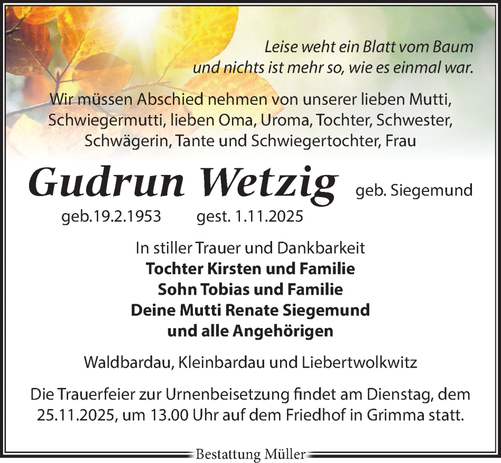 Hier finden Sie alle Traueranzeigen aus der Zeitung, die bisher für Gudrun Wetzig erschienen sind. Weitere Traueranzeigen, die in der Zeitung erscheinen, werden hier ebenfalls aufgelistet