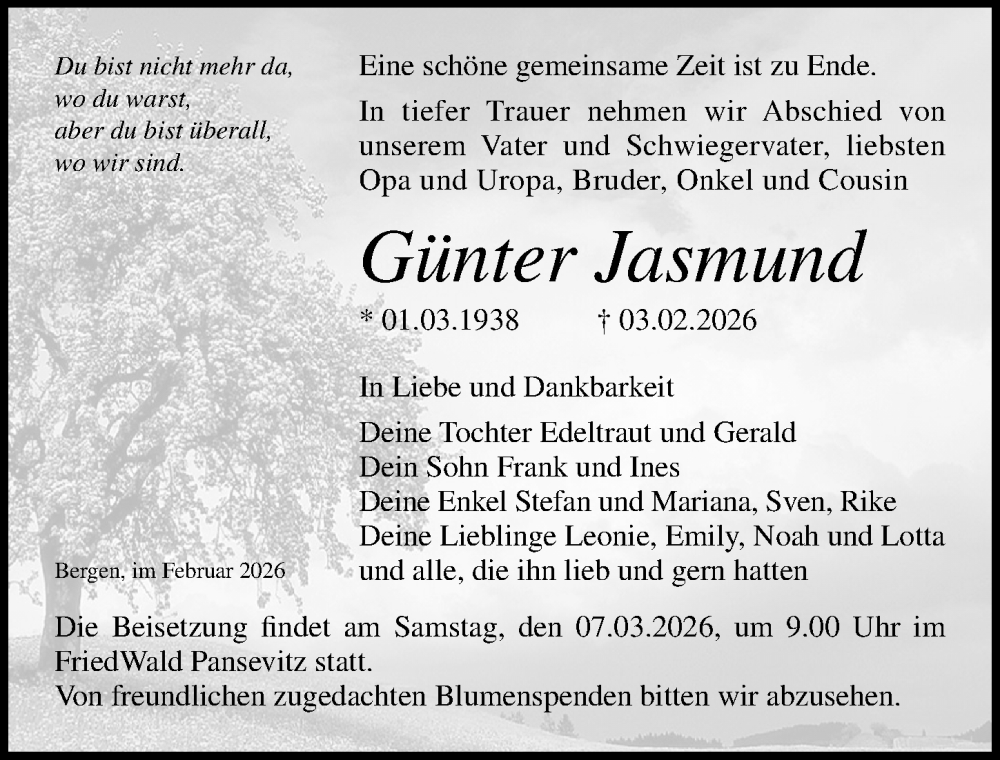 Hier finden Sie alle Traueranzeigen aus der Zeitung, die bisher für Günter Jasmund erschienen sind. Weitere Traueranzeigen, die in der Zeitung erscheinen, werden hier ebenfalls aufgelistet