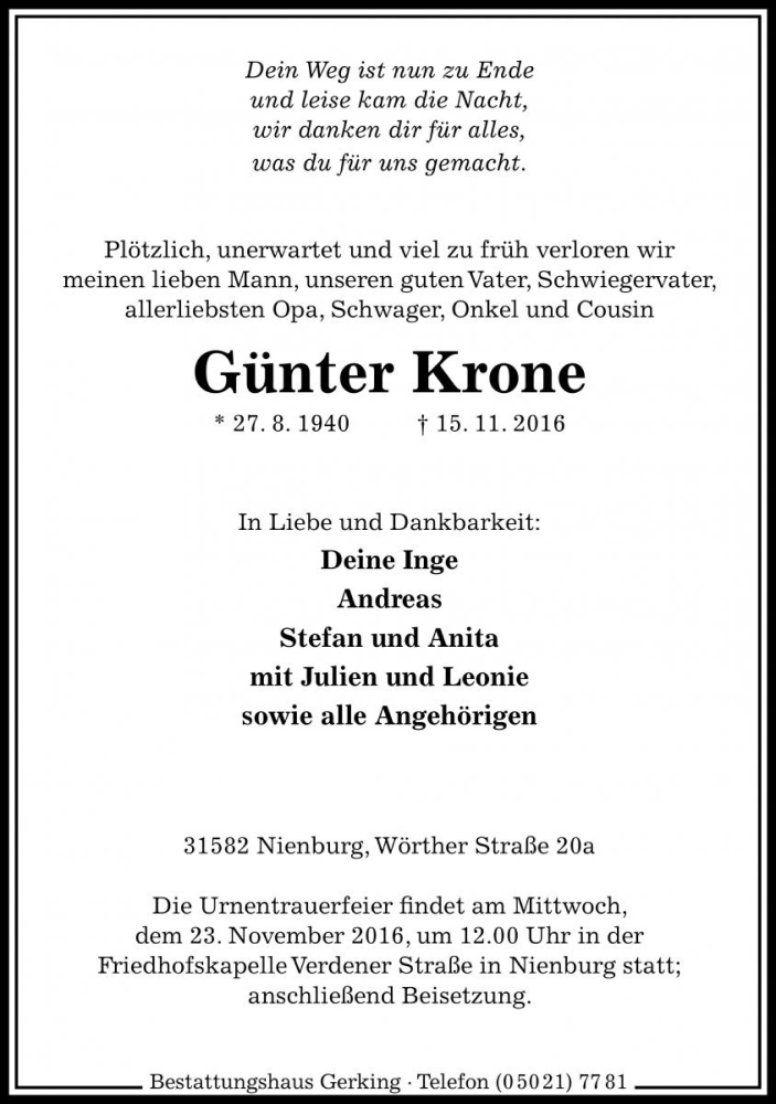 Hier finden Sie alle Traueranzeigen aus der Zeitung, die bisher für Günter Krone erschienen sind. Weitere Traueranzeigen, die in der Zeitung erscheinen, werden hier ebenfalls aufgelistet