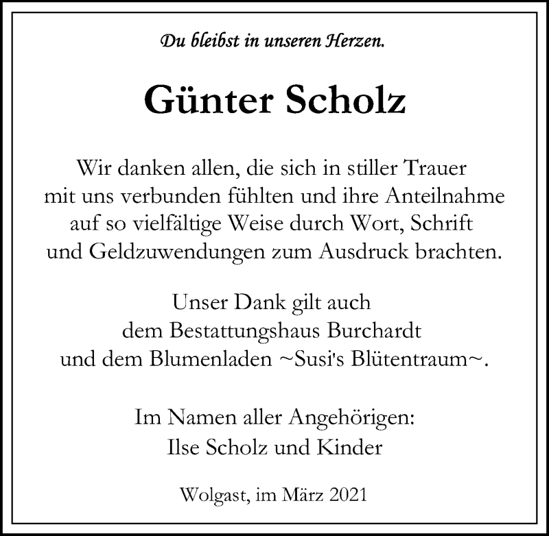 Hier finden Sie alle Traueranzeigen aus der Zeitung, die bisher für Günter Scholz erschienen sind. Weitere Traueranzeigen, die in der Zeitung erscheinen, werden hier ebenfalls aufgelistet