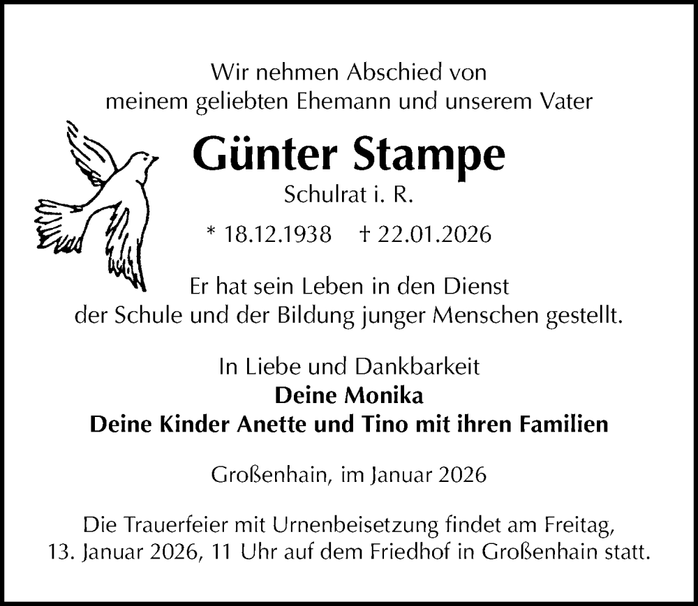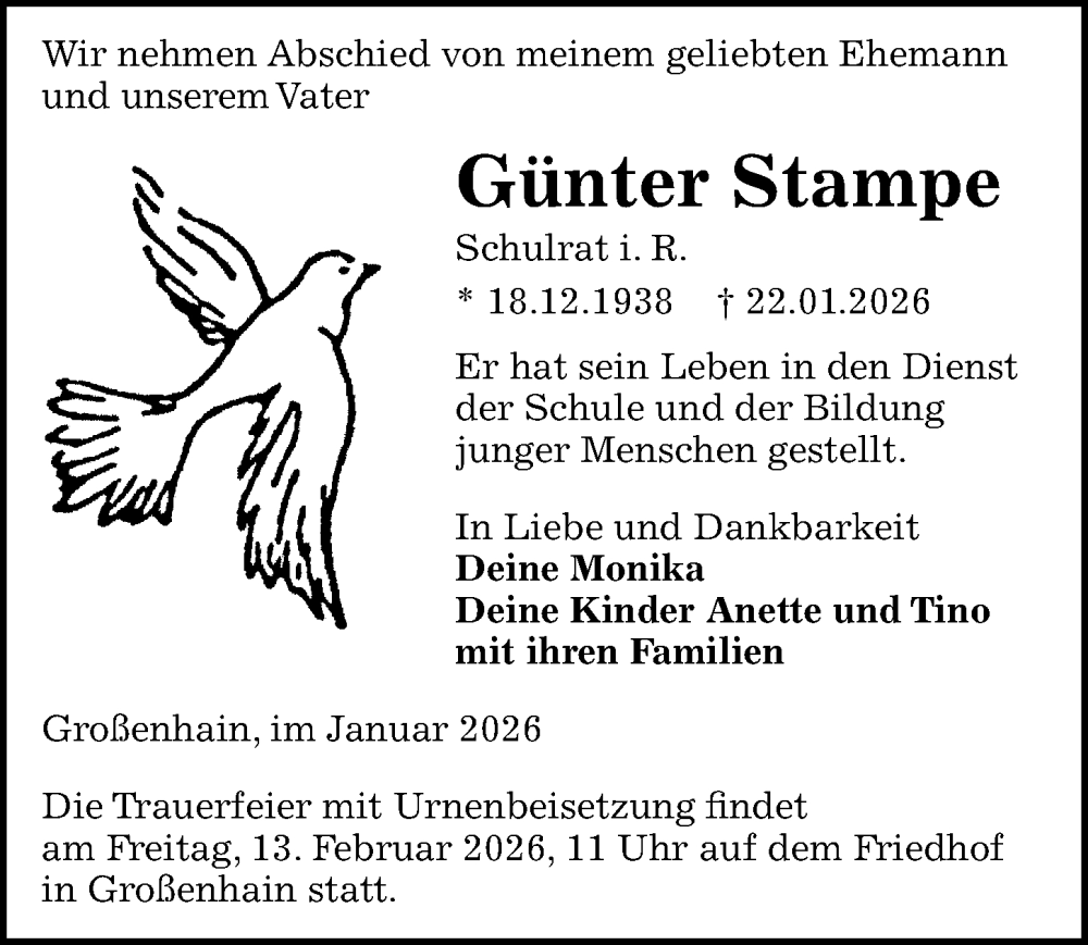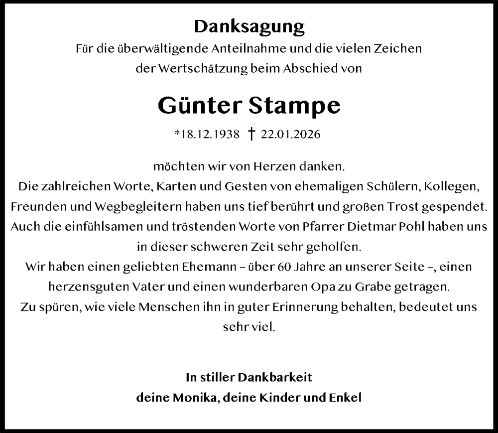 Hier finden Sie alle Traueranzeigen aus der Zeitung, die bisher für Günter Stampe erschienen sind. Weitere Traueranzeigen, die in der Zeitung erscheinen, werden hier ebenfalls aufgelistet