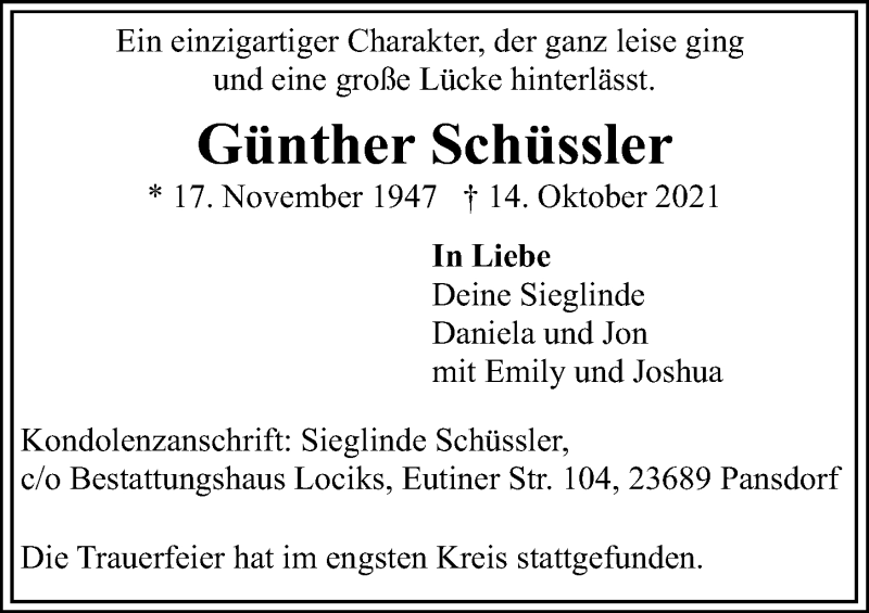 Hier finden Sie alle Traueranzeigen aus der Zeitung, die bisher für Günther Schüssler erschienen sind. Weitere Traueranzeigen, die in der Zeitung erscheinen, werden hier ebenfalls aufgelistet